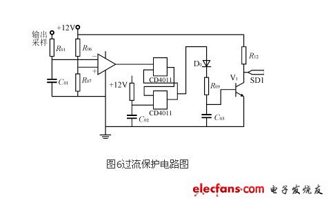 過流保護(hù)電路如圖6所示,它監(jiān)測輸出電流狀況,預(yù)設(shè)為1.5A。方波逆變器的輸出電流經(jīng)過采樣進(jìn)入運算放大器的反向輸入端,當(dāng)輸出電流大于1.5A后,運算放大器的輸出端跳轉(zhuǎn)為負(fù),經(jīng)過 CD4011組成的R-S觸發(fā)器后,使三級管V1基級的信號為低電平,三級管截止,向IR2011的SD1端輸出高電平,達(dá)到保護(hù)的目的。