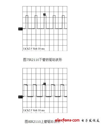 調(diào)試過程遇到的一個較為重要的問題是關(guān)于IR2110的自舉電容的選擇。IR2110的上管驅(qū)動是采用外部自舉電容上電,這就使得驅(qū)動電源的路數(shù)大大減少,但同時也對VB和VC之間的自舉電容的選擇也有一定的要求。經(jīng)過試驗后,最終采用1μF的電解電容,可以有效地滿足自舉電壓的要求。