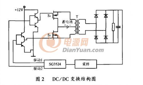 由于變壓器原邊電壓比較低,為了提高變壓器的利用率,降低成本,DC/DC變換如圖2所示,采用推挽式電路,原邊中心抽頭接蓄電池,兩端用開關(guān)管控制,交替工作,可以提高轉(zhuǎn)換效率。而推挽式電路用的開關(guān)器件少,雙端工作的變壓器的體積比較小,可提高占空比,增大輸出功率。