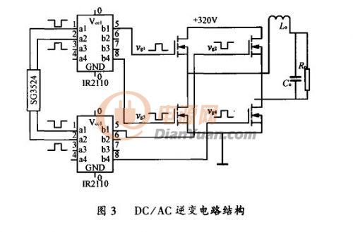 如圖3所示,DC/AC變換采用單相輸出,全橋逆變形式,為減小逆變電源的體積,降低成本,輸出使用工頻LC濾波。由4個(gè)IRF740構(gòu)成橋式逆變電路,IRF740最高耐壓400V,電流10A,功耗125W,利用半橋驅(qū)動(dòng)器IR2110提供驅(qū)動(dòng)信號(hào),其輸入波形由SG3524提供,同理可調(diào)節(jié)該SG3524的輸出驅(qū)動(dòng)波形的D<50%,保證逆變的驅(qū)動(dòng)方波有共同的死區(qū)時(shí)間。
