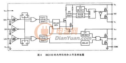 IR2110的內(nèi)部結(jié)構(gòu)和工作原理框圖如圖4所示。圖中HIN和LIN為逆變橋中同一橋臂上下兩個(gè)功率MOS的驅(qū)動(dòng)脈沖信號(hào)輸入端。SD為保護(hù)信號(hào)輸入端,當(dāng)該腳接高電平時(shí),IR2110的輸出信號(hào)全被封鎖,其對(duì)應(yīng)的輸出端恒為低電平;而當(dāng)該腳接低電平時(shí),IR2110的輸出信號(hào)跟隨HIN和LIN而變化,在實(shí)際電路里,該端接用戶的保護(hù)電路的輸出。HO和LO是兩路驅(qū)動(dòng)信號(hào)輸出端,驅(qū)動(dòng)同一橋臂的MOSFET
