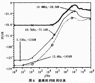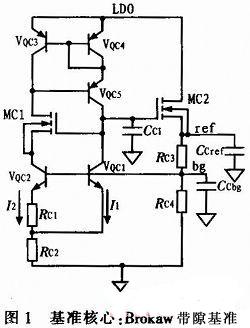 電子鎮(zhèn)流器的供電方式為半橋輸出接穩(wěn)壓管給芯片供電,其輸出電壓為高壓正弦波(50~100 kHz),加之芯片內(nèi)數(shù)字部分的干擾,這就給芯片的電源帶來(lái)較大的干擾。因此對(duì)芯片內(nèi)基準(zhǔn)的中頻PSR(Power Supply Rejection,電源抑制)有較大要求。本文從此角度在Brokaw帶隙基準(zhǔn)的基礎(chǔ)上進(jìn)行改進(jìn),采用LDO與基準(zhǔn)的級(jí)聯(lián)設(shè)計(jì)來(lái)增加其PSR。
