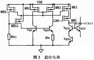 這樣雖然能啟動(dòng),但是,正常工作時(shí),此大啟動(dòng)電流bias-start將通過(guò)VQCS1和VQCS3流向地,增加了系統(tǒng)的負(fù)擔(dān)。因此,在電流輸出管MB3下加入控制管MBC,并使得在正常工作時(shí),LDO的高電壓足以使MBC關(guān)斷,從而降低啟動(dòng)電路的損耗。