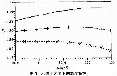 圖5為不同工藝角下的溫漂仿真。仿真結(jié)果表明,此電路可以達(dá)到ref-45 ppm、bg-7.5 ppm的低溫漂。實(shí)際電路存在器件的不匹配和誤差等,雖然達(dá)不到理論上的溫漂,但通過(guò)仔細(xì)布版、修調(diào)帶隙核心電路中Rc1、Rc2,可以達(dá)到較低的溫漂。