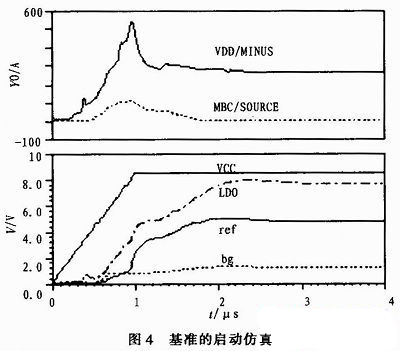 MBC控制作用的簡(jiǎn)述:在1μs時(shí)流過(guò)100μA的啟動(dòng)電流,當(dāng)LDO、ref、bg建立最低工作電壓后,啟動(dòng)電路開(kāi)始關(guān)斷過(guò)程,電流急劇減小,并最終在2μs時(shí)接近0A。整個(gè)電路正常運(yùn)行時(shí)消耗的電流是266μA。