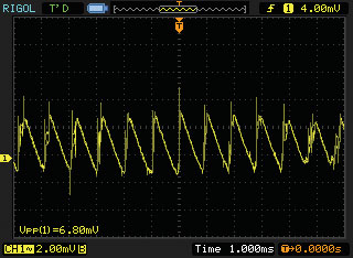 測(cè)試輸出電壓紋波時(shí),首先由工控機(jī)來(lái)控制程控電源輸出,其輸出能夠使電源進(jìn)入正常工作狀態(tài),然后控制程控電子負(fù)載使電源達(dá)到100%負(fù)載狀態(tài),再由多通道開(kāi)關(guān)將DS1302CA示波器接入到電源的輸出端,通過(guò)工控機(jī)將數(shù)字示波器設(shè)置為直流耦合,使用1:1的探針輸入。另外,為了便于更好地觀察穩(wěn)定的紋波信號(hào),可以打開(kāi)示波器的“帶寬限制”。最后,將數(shù)字示波器測(cè)量出的紋波信號(hào)峰峰值上傳至計(jì)算機(jī)中存儲(chǔ)起來(lái),便得到了該電源的紋波電壓,如圖4所示。