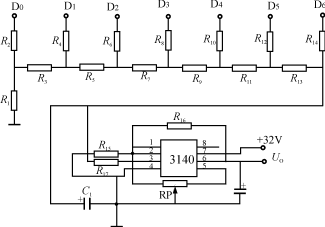 這需要將計(jì)數(shù)器的二進(jìn)制數(shù)轉(zhuǎn)化為電壓。顯然用D/A轉(zhuǎn)換是可以的,但電路復(fù)雜程度上升,成本也有所提高。故為了簡(jiǎn)化電路我們僅借用D/A轉(zhuǎn)換網(wǎng)絡(luò)的思想,利用權(quán)電阻T形網(wǎng)絡(luò)將4516的7位數(shù)值變換成模擬量輸出,推動(dòng)電壓表指示,見圖5。