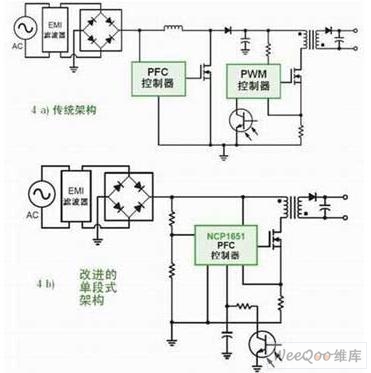 在這類(lèi)可能需要采用PFC控制器的應(yīng)用中,傳統(tǒng)的解決方案是PFC控制器+PWM控制器的兩段式方案。這種方案支持模塊化,且認(rèn)證簡(jiǎn)單,但在總體能效方面會(huì)有折衷,如假設(shè)交流-直流(AC-DC)段的能效為87%至90%,直流-直流(DC-DC)段能效為85%至90%,則總能效僅為74%至81%。隨著LED技術(shù)的持續(xù)改進(jìn),這種架構(gòu)預(yù)計(jì)將轉(zhuǎn)化為更加優(yōu)化、更高能效的方案。根據(jù)要求的不同,有多種可供選擇的方案,如:PFC+非隔離降壓、PFC+非隔離反激或半橋LLC、NCP1651/NCP1652單段式PFC方案。