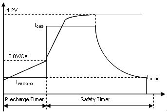 預(yù)充電安全定時(shí)器可避免長(zhǎng)時(shí)間給電量耗盡的電池充電。一般說(shuō)來(lái),電池單元電壓達(dá)到 3.0 V,充電器就會(huì)進(jìn)入 CC 階段??焖俪潆婋娏魍ǔO薅ㄔ?0.5 至 1C 之間,以避免過(guò)熱導(dǎo)致電池加速退化。應(yīng)選擇適當(dāng)?shù)乃俣?,確保電池溫度不超過(guò) 45oC,然后在快充速率下進(jìn)行電池充電,直至電壓達(dá)到調(diào)節(jié)限度(對(duì)基于 LiCoO2 的陰極而言通常是每單元 4.2 V)。充電器開(kāi)始調(diào)節(jié)電池電壓并進(jìn)入 CV 階段,這時(shí)充電電流會(huì)呈指數(shù)地下降至預(yù)定終止水平,結(jié)束電池充電。