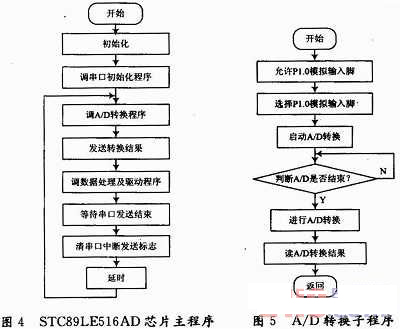 數(shù)據(jù)的采集與處理單元采用自帶A/D轉(zhuǎn)換器的STC89LE516AD單片機芯片,完成數(shù)據(jù)采集、模數(shù)轉(zhuǎn)換、數(shù)據(jù)處理以及驅(qū)動顯示單元。當(dāng)時鐘在40 MHz以下時,每17個機器周期可完成一次A/D轉(zhuǎn)換。STC89LE516AD單片機與差動脈沖寬度調(diào)制集成電路結(jié)合起來,完成電容傳感器的檢測。其主程序和A/D轉(zhuǎn)換程序流程圖如圖4,圖5所示。