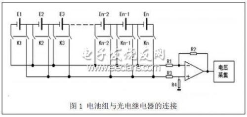 本文作者曾經(jīng)基于光電繼電器隔離法設(shè)計了一套電池管理系統(tǒng),單體電池電壓的測量是采用分時測量的方法。串聯(lián)電池組中各個電池的兩端通過光電繼電器隔離,然后統(tǒng)一連接到檢測總線上。按照一定的時間策略控制光電繼電器的通斷,可控制單體電池在不同的時間段單獨(dú)將電壓施加在檢測總線上,從而實(shí)現(xiàn)單體電池電壓的分時檢測。該方法的巡檢周期短,測量精度高。但是控制光電繼電器的通斷需要占用大量的I/O 資源,這就限制了電池管理系統(tǒng)可管理電池的數(shù)量。同時在電池管理系統(tǒng)的實(shí)際安裝時,由于電池兩端需要引線到采集模塊,所以就會有比較多的走線,導(dǎo)致電池管理系統(tǒng)安裝的不方便及電動車電氣走線的復(fù)雜性。本文為了改善以上的不足,提出一種新的光電繼電器控制策略。光電繼電器與串聯(lián)電池組的連接方式如圖1 所示。