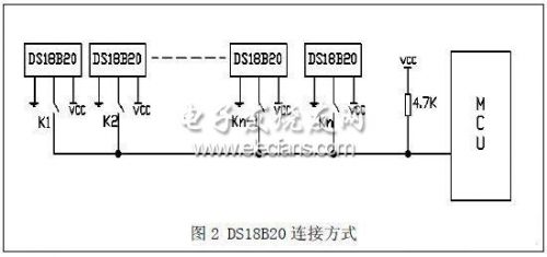度采樣。需要說明的是,采用DS18B20 多點(diǎn)組網(wǎng)功能也可以實(shí)現(xiàn)單體電池溫度采樣,但是多點(diǎn)采樣時需要識別每個DS18B20 獨(dú)有的ROM 碼,影響采樣速度,同時無法將ROM碼同器件的實(shí)際物理位置關(guān)聯(lián)起來,所以多點(diǎn)組網(wǎng)功能不適合單體電池溫度的巡檢。基于由D 觸發(fā)器構(gòu)成的移位寄存陣所具有的通道選通功能,本文提出一種同時啟動,分時讀取數(shù)據(jù)的DS18B20 多點(diǎn)溫度采樣方法。該種方法中DS18B20的采樣啟動和數(shù)據(jù)讀取都是跳過ROM 碼校驗(yàn)進(jìn)行的。DS18B20 的連接方式如圖2 所示。