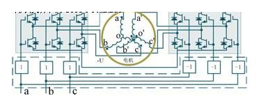 為了消除pwm電機驅(qū)動系統(tǒng)共模電流,a.consoli等學(xué)者基于共模電壓補償技術(shù),提出了一種應(yīng)用于由兩個或多個功率變換器組成的多驅(qū)動系統(tǒng)公共直流母線共模電流消除技術(shù),拓撲結(jié)構(gòu)見圖6所示。該方法是在兩個功率變換器做適當(dāng)連接的基礎(chǔ)上,通過控制兩個變換器狀態(tài)序列而使共模電壓同步變化的新pwm調(diào)制策略。