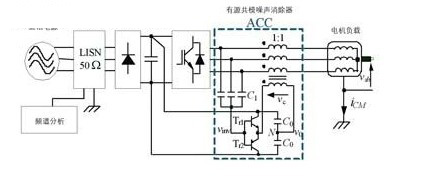 傳統(tǒng)的用于消除共模電壓的有源濾波器如圖8所示,文獻將其稱為有源共模噪聲消除器,acc連接在逆變器的輸出端和三根電纜之間,由共模電壓傳感器、補償電路和共模變壓器組成,acc在逆變器輸出端疊加一個補償電壓,該補償電壓與pwm逆變器產(chǎn)生的共模電壓極性相反、幅值相等,從而使施加在負載上的共模電壓被完全消除,也就減小了共模電流和傳導(dǎo)emi。