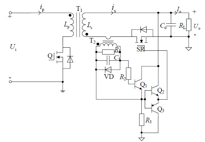 該驅(qū)動(dòng)電路的基本工作原理:電流互感器T2 與次級(jí)同步整流管SR 串聯(lián)在同一支路,用來(lái)檢測(cè)SR 的電流。當(dāng)有電流流過(guò)SR 的體二極管,則在電流互感器的二次側(cè)感應(yīng)出電流,該電流通過(guò)R1 轉(zhuǎn)變成電壓,當(dāng)電壓值達(dá)到并超過(guò)晶體管Q1 的發(fā)射結(jié)正向電壓時(shí),Q1 導(dǎo)通,達(dá)到二極管VD 導(dǎo)通電壓時(shí),VD 導(dǎo)通對(duì)其箝位。晶體管Q1 導(dǎo)通后,輸出電壓通過(guò)圖騰柱輸出電路驅(qū)動(dòng)SR 開(kāi)通。當(dāng)SR 中的電流在電流互感器二次側(cè)電阻R1 上的采樣電壓降低到Q1 的導(dǎo)通閾值以下時(shí),Q1 關(guān)斷,SR 關(guān)斷。