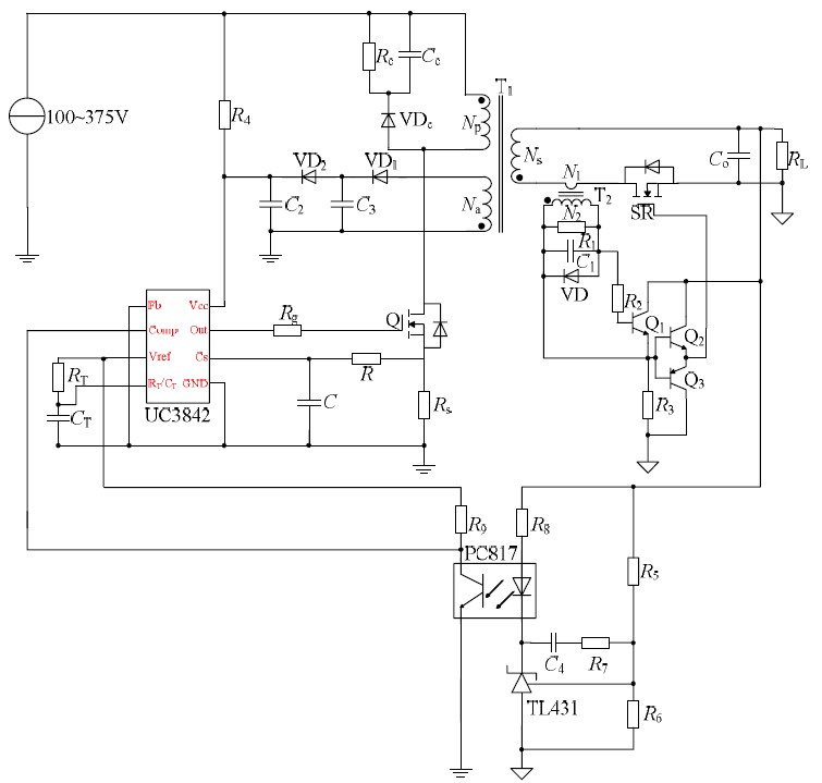 反激變換器應(yīng)用廣泛,采用同步整流技術(shù)能夠很好的提高反激變換器效率,同時(shí)為使同步整流管的驅(qū)動(dòng)電路簡(jiǎn)單,采用分立元件構(gòu)成驅(qū)動(dòng)電路。本文詳細(xì)分析了同步整流反激變換器的工作原理和該驅(qū)動(dòng)電路的工作原理,并在此基礎(chǔ)上設(shè)計(jì)了100V~375VDC 輸入,12V/4A 輸出的同步整流反激變換器,工作于電流斷續(xù)模式,控制芯片選用UC3842,對(duì)設(shè)計(jì)過(guò)程進(jìn)行了詳細(xì)論述。通過(guò)Saber 仿真驗(yàn)證了原理分析的正確性,證明該變換器具有較高的變換效率。