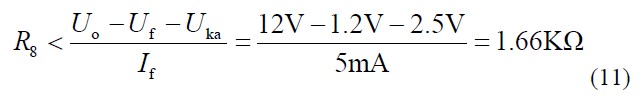 TL431 正常工作時(shí)需要陰極至陽(yáng)極電壓Uka 大于2.5V,PC817 二極管正向?qū)▔航礥f為1.2V。所以: