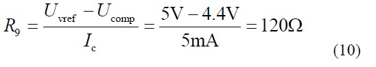 式中Uvref 為芯片8 腳電壓5V, U comp 為芯片1 腳電壓,計(jì)算時(shí)取系統(tǒng)穩(wěn)定時(shí)1 腳電壓最大值。