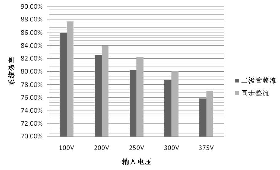 應(yīng)用 Saber 仿真軟件對(duì)本文設(shè)計(jì)的同步整流反激變換器進(jìn)行仿真。圖4 為輸入電壓200V,滿載時(shí),初級(jí)MOS 管Q、次級(jí)同步整流管SR 驅(qū)動(dòng)信號(hào)和次級(jí)電感電流波形。由圖可見(jiàn),Q 關(guān)斷后,SR 經(jīng)過(guò)很短的延遲后就開(kāi)通,次級(jí)電感電流降至接近零時(shí),SR 關(guān)斷。圖5 為輸入電壓100V、200V、250V、300V 和375V,滿載條件下,分別采用同步整流和二極管整流時(shí),系統(tǒng)效率的分布圖。