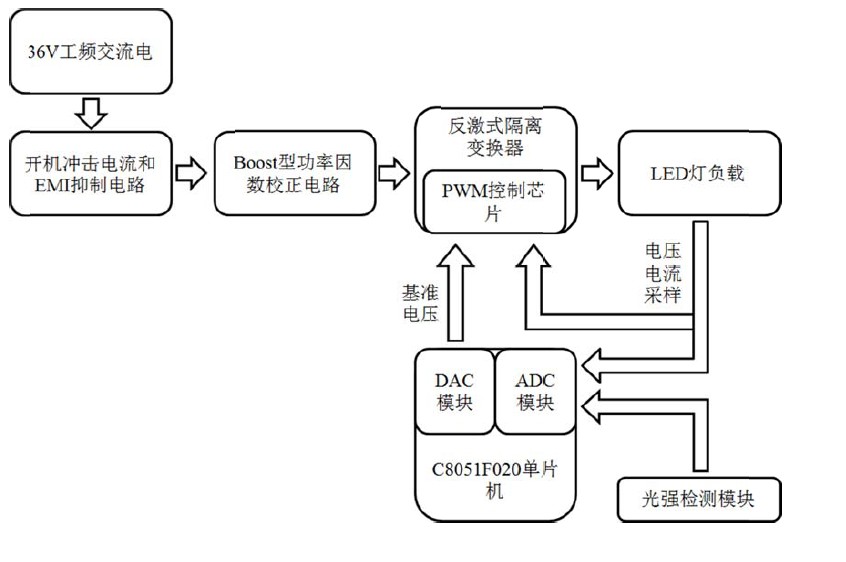 220VAC經(jīng)工頻變壓器降壓為36VAC,經(jīng)開(kāi)機(jī)沖擊電流抑制電路輸入到功率因數(shù)校正電路中,再經(jīng)高頻隔離變壓器給串聯(lián)在一起的LED燈供電,在LED燈處分別進(jìn)行電壓、電流采樣,返回給PWM控制芯片和單片機(jī),由單片機(jī)給定基準(zhǔn)電壓來(lái)控制PWM控制芯片,進(jìn)而達(dá)到控制LED燈恒流可調(diào)的目的。系統(tǒng)總體結(jié)構(gòu)框圖如圖1所示。