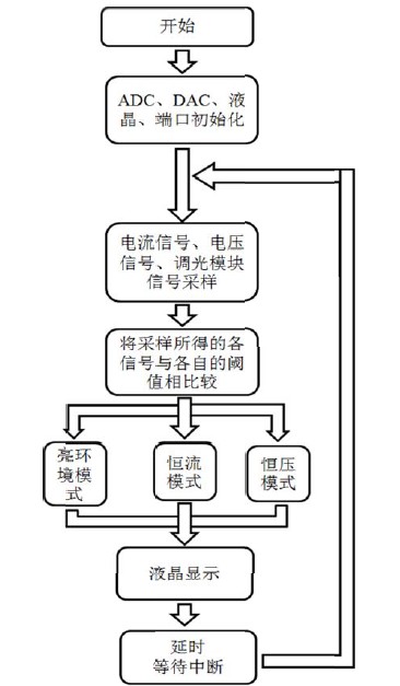 由于本LED 恒流電源工作時(shí)絕大部分時(shí)間處于穩(wěn)定狀態(tài),且對(duì)反應(yīng)速度沒(méi)有過(guò)快要求,因此并不需要對(duì)電壓、電流信號(hào)進(jìn)行同時(shí)的采樣,而可以分別采樣,模式切換和基準(zhǔn)電壓的調(diào)整也不需在中斷服務(wù)中完成,只有步進(jìn)調(diào)整電流的按鍵程序需要在中斷服務(wù)中完成。
