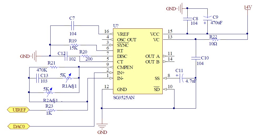 SG3525 的1、2 引腳分別為內(nèi)部誤差放大器的反相輸入端和同相輸入端,反相輸入端接收反饋的電壓信號(hào),同相輸入端為給定的電壓基準(zhǔn),一般接在16 引腳電壓基準(zhǔn)的分壓上,由于題目要求恒流輸出時(shí)電流步進(jìn)可調(diào),故同相輸入端接單片機(jī)DAC 模塊產(chǎn)生的參考電壓。