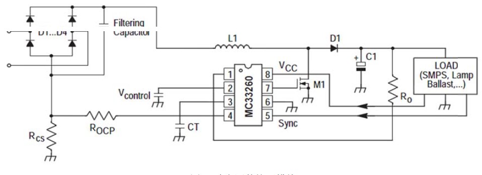 選用小功率功率因數(shù)校正芯片MC33260,它工作在電流臨界模式。MC33260應(yīng)用簡(jiǎn)單可靠。通過(guò)電流檢測(cè)和電壓反饋,通過(guò)PI調(diào)節(jié)來(lái)保持電壓恒定。通過(guò)對(duì)開(kāi)關(guān)管的PWM控制來(lái)得到所需要電壓??蓪?shí)現(xiàn)0.998的功率因數(shù)校正和輸出穩(wěn)定直流電壓的功能。