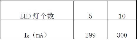 輸入電壓為36.23V,設(shè)定電流為300mA,負(fù)載從5 個(gè)LED 到10 個(gè)LED 時(shí)輸出電流波動(dòng)范圍是209mA~300mA。調(diào)整率為0.4%。負(fù)載調(diào)整率SL≤1%達(dá)到要求。
