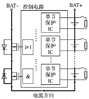 系統(tǒng)中控制電路部分單節(jié)鋰電池保護(hù)芯片的充電過(guò)電壓保護(hù)控制信號(hào)經(jīng)光耦隔離后并聯(lián)輸出,為主電路中充電開(kāi)關(guān)器件的導(dǎo)通提供柵極電壓;如某一節(jié)或幾節(jié)鋰電池在充電過(guò)程中先進(jìn)入過(guò)電壓保護(hù)狀態(tài),則由過(guò)電壓保護(hù)信號(hào)控制并聯(lián)在單節(jié)鋰電池正負(fù)極兩端的分流放電支路放電,同時(shí)將串接在充電回路中的對(duì)應(yīng)單體鋰電池?cái)嚯x出充電回路。