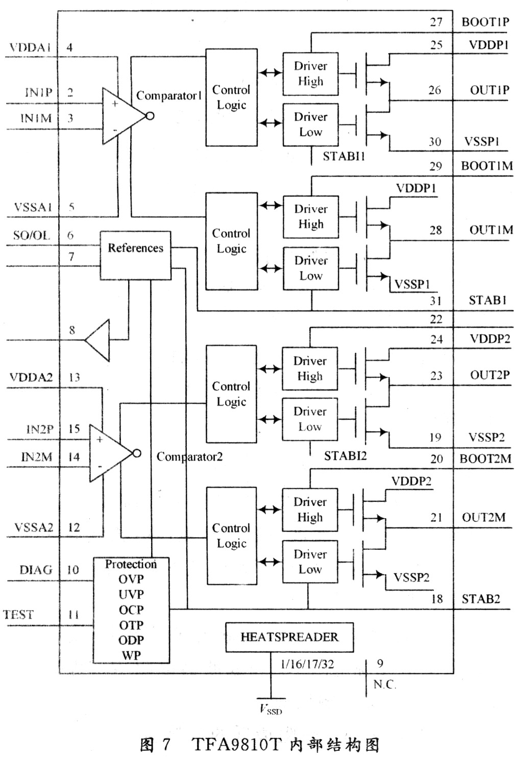 TFA9810T是NXP公司推出的雙通道額定輸出2×12 W的高效Class-D類功放,主要由兩組全橋功率放大器(Full-Bridge)、驅動前端、邏輯控制、OVP/OCP/OTP等保護電路、全差分輸入比較器、供電模塊等構成,如圖7所示。