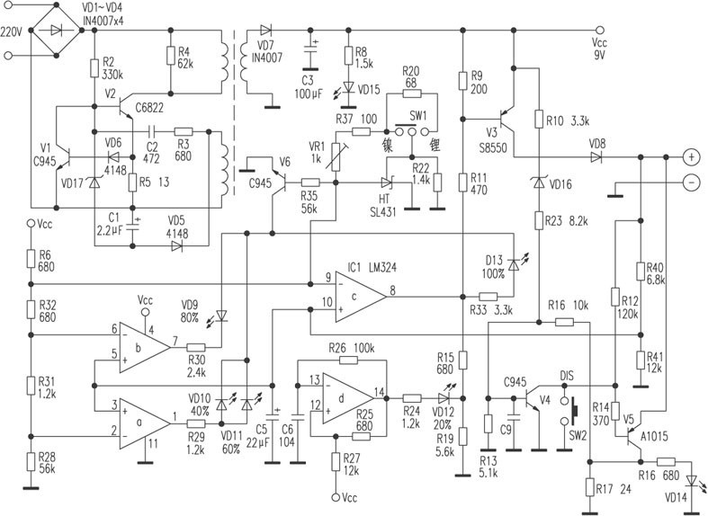 如果是為鎳鎘、鎳氫電池充電,由于這類電池存在一定的記憶效應(yīng),需不定時對其進(jìn)行放電。SW1是鎳鎘、鎳氫、鋰離子電池充電轉(zhuǎn)換開關(guān)。SW1與精密基準(zhǔn)電源SL431為運(yùn)放LM324 ⑨提供兩個不同的精密基準(zhǔn)源,由SW1切換。在給鎳鎘、鎳氫電池充電時,LM324 ⑨腳的基準(zhǔn)電壓約0.09V(空載);在給鋰離子電池充電時,LM324 ⑨腳的基準(zhǔn)電壓約為0.08V(空載),這種設(shè)計(jì)是由這兩種類型電池特有的化學(xué)特性決定的。按下SW2,V5基極瞬間得一低電平而導(dǎo)通,可充電池上的殘余電壓通過V5的e c極在R17上放電,同時放電指示燈VD14點(diǎn)亮。在按下SW2后會隨即釋放,這時可充電池上的殘余電壓通過R16、R13分壓,C9濾波后為V4的基極提供一個高電平,V4導(dǎo)通,這相當(dāng)于短接SW2。隨著放電時間的延長,可充電池上的殘余電壓也越來越低,當(dāng)V4基極上的電壓不能維持其繼續(xù)導(dǎo)通時,V4截止,放電終止,充電器隨即轉(zhuǎn)入充電狀態(tài)。