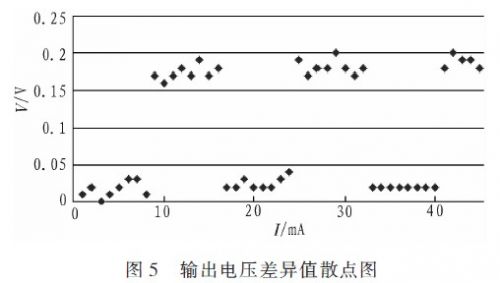 在軟硬件設(shè)計全部完成后的測試階段,發(fā)現(xiàn)DA輸出的電壓值在某些點上與理論值不符,具有較大差異并呈現(xiàn)一定的周期性(且都是輸出值比理論值小)。通過初步分析,認為是DA的控制字寫入在某些點上不正確,于是將硬件電路上AD的模擬電壓輸入引腳斷開并直接接在DA電壓輸出腳,并編寫了測試小程序,將0~5V每次遞增0.02V對應(yīng)的控制字寫入DA,用AD測其輸出電壓值并將結(jié)果通過串口返回PC,然后將電壓理論值與實測值的差值全部導(dǎo)入Excel,然后在Excel中插入這些值的散點圖,散點圖如圖5所示,0~250mA電流值分別對應(yīng)0~5V的電壓值(圖中截取了0~45mA這一段),縱坐標為輸出電壓理論值與實際值的差異值。