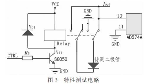 特性測試電路如圖3所示,圖中左側(cè)為繼電器控制電路,當CTRL端為高電平時,三極管VT1導(dǎo)通,VCC通過VT1加載到繼電器5引腳,繼電器動作,被測二極管接入極性轉(zhuǎn)換,二極管極性匹配后,即可進行特性測試。