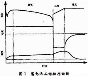 蓄電池在工作工程中主要具有3種工作狀態(tài):放電狀態(tài)、充電狀態(tài)和浮充狀態(tài)。處于放電狀態(tài)時(shí),蓄電池將儲(chǔ)蓄的化學(xué)能轉(zhuǎn)化為電能供給負(fù)載;充電狀態(tài)是在蓄電池放電之后進(jìn)行能量?jī)?chǔ)蓄的狀態(tài),此種狀態(tài)下電能轉(zhuǎn)化為化學(xué)能存儲(chǔ)起來;浮充狀態(tài)則是蓄電池維持一定化學(xué)能存儲(chǔ)量所要保持的工作狀態(tài),浮充狀態(tài)下的蓄電池的儲(chǔ)能不會(huì)因?yàn)樽苑烹姸鴵p失。放電、充電、浮充電3個(gè)狀態(tài)構(gòu)成蓄電池的一個(gè)完整的工作循環(huán)。傳統(tǒng)的充電器采用串聯(lián)充電方式,通過各個(gè)電池的電流都是一樣的。盡管采用了三段式的充電方法,但是充電時(shí)能控制的電壓只是電池組的串聯(lián)電壓,仍然伴有電池組充電不均衡并且擴(kuò)大的現(xiàn)象。蓄電池工作狀態(tài)曲線如圖1所示。因此在此基礎(chǔ)上采用一種新的解決方法。