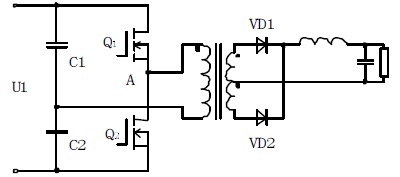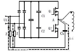 在PWM變換器工作時,伴隨著開關(guān)器件的工作,也相應(yīng)產(chǎn)生了共模噪聲。如圖1 所示,對于半橋變換器,開關(guān)管Q1 的漏級電壓始終為U1,源級電位隨開關(guān)狀態(tài)的改變而在0 和U1/2 之間變化;Q2 的源極電位始終為0,漏極電位在0 和U1/2之間變化。為使開關(guān)管和散熱器能保持良好接觸,往往在開關(guān)管底部與散熱器之間加上絕緣墊片或者抹上導(dǎo)熱性能良好的絕緣硅膠。這使得A 點對地之間相當于存在一個并聯(lián)耦合電容CK。當開關(guān)管Q1、Q2 的狀態(tài)發(fā)生改變,使A 點電位發(fā)生變化時,就會在CK 上產(chǎn)生噪聲電流Ick,如圖2 所示。該電流由散熱器到達機殼,而機殼也即大地與主電源線存在耦合阻抗,形成圖2中虛線所示的共模噪聲通路。于是,共模噪聲電流在地與主電源線的耦合阻抗Z 上產(chǎn)生壓降,形成共模噪聲。