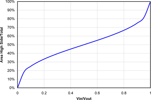 通過圖1,我們知道 50% 轉(zhuǎn)換比率時出現(xiàn)最佳傳導損耗極值。但是,在其他轉(zhuǎn)換比率條件下,可以將損耗降至這一水平以下。附錄 1 給出了進行這種優(yōu)化的數(shù)學計算方法,而圖 2 顯示了其計算結(jié)果。即使在極低的轉(zhuǎn)換比率條件下,F(xiàn)ET 芯片面積的很大一部分都應(yīng)該用于高側(cè) FET。高轉(zhuǎn)換比率時同樣如此;應(yīng)該有很大一部分面積用于低側(cè)。這些結(jié)果是對這一問題的初步研究,其并未包括如高側(cè)和低側(cè)FET之間的各種具體電阻值,開關(guān)速度的影響,或者對這種芯片面積進行封裝相關(guān)的成本和電阻等諸多方面。但是,它為確定 FET 之間的電阻比提供了一個良好的開端,并且應(yīng)會在FET選擇方面實現(xiàn)更好的整體折中。