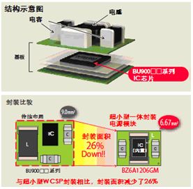 此次羅姆開發(fā)的“BZ6A系列”將6MHz動(dòng)作的高速開關(guān)電源IC“BU9000X系列”內(nèi)置于基板,同時(shí),將所需零部件封裝于一體。不僅保持了產(chǎn)品的高性能,而且實(shí)現(xiàn)了業(yè)內(nèi)最小尺寸的超小型電源模塊。由于不再需要外置零部件,因此,簡(jiǎn)化了開關(guān)電源電路的設(shè)計(jì)的同時(shí)使超小型化、高密度封裝成為可能,為縮短各種設(shè)備的開發(fā)周期做出了巨大貢獻(xiàn)。另外,輸入電壓范圍更寬,達(dá)2.3V~5.5V,因此,可用于具有USB 接口、5V輸出的移動(dòng)設(shè)備等。不僅如此,輸出電壓還可個(gè)別對(duì)應(yīng)1.0V~3.3V范圍的產(chǎn)品,不僅可用于移動(dòng)設(shè)備,還可用于其他各種產(chǎn)品中。