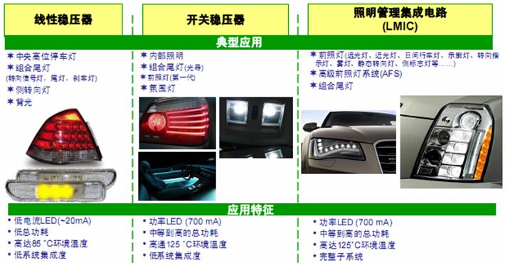 隨著LED性能不斷提升及成本不斷下降,在汽車內(nèi)部及外部照明中的應(yīng)用領(lǐng)域越來越寬。不同應(yīng)用對LED電流的要求又各不相同,故需要結(jié)合具體應(yīng)用要求,選擇適合的LED驅(qū)動器方案,如線性恒流穩(wěn)流器、線性穩(wěn)壓器或開關(guān)穩(wěn)壓器等。本文介紹幾種應(yīng)用比較廣泛的LED驅(qū)動器及具體方案,供設(shè)計人員在進行汽車照明設(shè)計時參考。