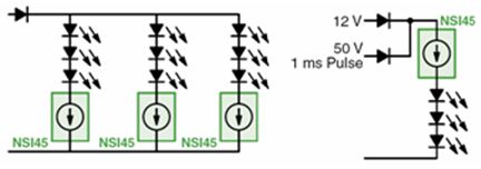 適合低電流LED應(yīng)用的CCR,可以采用安森美半導(dǎo)體運用專利自偏置晶體管(SBT)技術(shù)開發(fā)出來得NSI45系列。這系列CCR包含雙端固定輸出和三端可調(diào)節(jié)輸出兩種類型,電流等級涵蓋10至180 mA,雙端及三端CCR電路圖如圖2所示。其中三端可調(diào)節(jié)輸出CCR包括電流30至80 mA(SOT-223)及60至150 mA(DPAK)等不同選擇,能夠用于滿足特定電流設(shè)置要求。