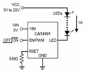 而在要求驅(qū)動大電流的高亮度LED汽車照明應(yīng)用中,可以采用安森美半導(dǎo)體的CAT4101高亮度線性LED驅(qū)動器。CAT4101能驅(qū)動一串電流高達1 A的高亮度LED,且滿載時的壓降僅為極低的0.5 V。這種簡單方案不要求電感,消除開關(guān)噪聲,將元件數(shù)量減至最少,并簡化設(shè)計,典型應(yīng)用電路如圖5所示。