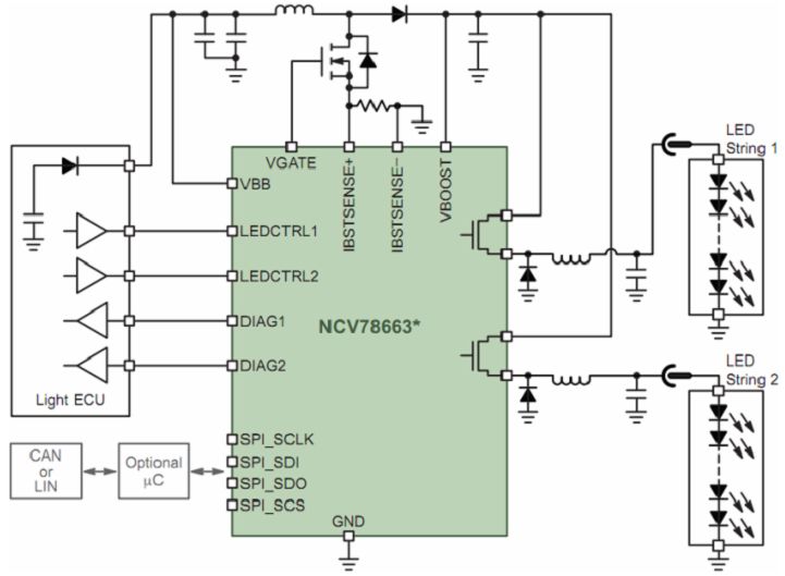 一般而言,汽車前照燈要求支持從單個LED到多串LED,電壓可高達60 V;此外,還要求支持脈寬調(diào)制(PWM)調(diào)光(如用于示廓燈)、高集成度、高能效、LED串低電磁輻射、集成診斷及通信接口等。安森美半導(dǎo)體針對LED汽車前照燈系統(tǒng)開發(fā)了NCV78663電源鎮(zhèn)流器及雙LED驅(qū)動器。NCV78663是先進的高可靠性、高能效的系統(tǒng)級芯片(SoC) LED驅(qū)動器,支持達2 A電流,提供高于90%的總能效,驅(qū)動高達60 V電壓的多串LED,能以PWM調(diào)光維持色溫及控制平均電流,使設(shè)計人員能夠以一顆高集成度的SoC控制遠光燈及近光燈、日間行車燈、轉(zhuǎn)向指示燈及霧燈,所需外部元件極少。這器件通過SPI接口與外部微控制器通信,在上電后動態(tài)地控制系統(tǒng)參數(shù)、檢測LED工作狀態(tài)并反饋診斷信息。圖8顯示的是NCV78663在先進的汽車前照燈應(yīng)用中的電路圖。