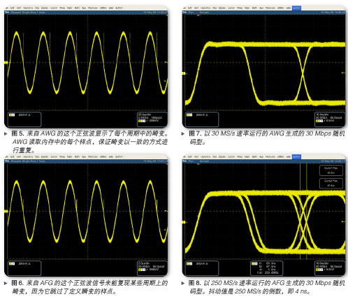 之所以出現(xiàn)抖動(dòng),是因?yàn)锳FG擁有固定的取樣速率,其不是數(shù)據(jù)速率的倍數(shù)。AWG則沒有這種限制(盡管任何實(shí)際環(huán)境信號(hào)源都會(huì)產(chǎn)生某些抖動(dòng))。