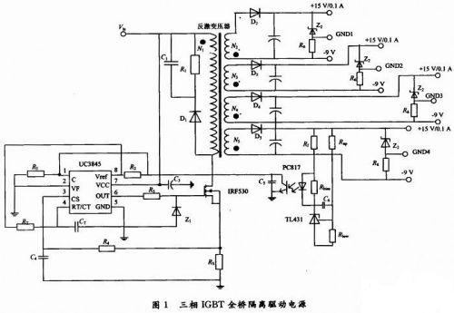 三相IGBT全橋隔離驅(qū)動電源采用電流型PWM控制器LIC3845,輸出4路相互隔離的+15 V/-9 V,如圖1所示。其中,一路額定輸出電流為0.2 A,用于三相全橋下橋臂共射極連接的3個IGBT的驅(qū)動供電,另外3路額定輸出電流為0.1 A,分別用于上橋臂的3個IGBT的驅(qū)動供電。