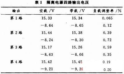 對設計的電路進行實驗,得出了實驗數(shù)據(jù)和波形。表1為隔離電源在空載和帶載(+15 V,-9 V/0.2 A一路輸出帶載240 Ω,另外3路輸出各帶載120 Ω)下的4路輸出電壓值及相應的負載調(diào)整率。