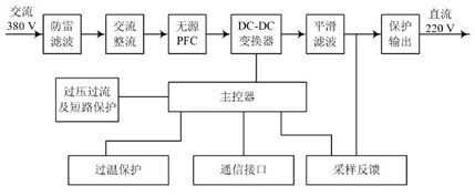 本文設(shè)計(jì)的整流模塊的工作原理框圖如圖2 所示,工作時(shí), 模塊首先通過過防雷處理和濾波對(duì)輸入的三相交流進(jìn)行處理, 這樣才能保證模塊后級(jí)電路的安全; 經(jīng)過處理后的三相交流經(jīng)過整流和無源PFC 后轉(zhuǎn)換成高壓直流時(shí), 這時(shí)轉(zhuǎn)換的高壓直流要經(jīng)過DC/ DC 變換器再次轉(zhuǎn)換成可變的直流電壓輸出; 另外模塊控制部分還有負(fù)責(zé)過壓、過流以及短路保護(hù)等作用, 這樣才能保證輸出電壓的穩(wěn)定, 也同時(shí)能對(duì)模塊各部件進(jìn)行保護(hù)。模塊還在遠(yuǎn)程監(jiān)控中提供了 四遙 ( 遙控、遙調(diào)、遙測(cè)、遙信) 接口。