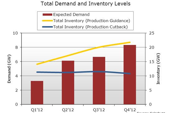 Q1’12-Q4’12全球光伏需求與電池片/組件庫(kù)存比較
