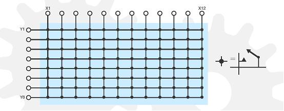 實(shí)現(xiàn)開關(guān)切換的一個(gè)比較通用的方法就是采用交叉點(diǎn)開關(guān)或矩陣排列來(lái)實(shí)現(xiàn)。在矩陣開關(guān)中,一系列的橫向(X軸方向)和縱向(Y軸方向)線路在每個(gè)交叉點(diǎn)上相互連接著。開關(guān)最簡(jiǎn)單的結(jié)構(gòu)是,在通常的狀態(tài)下是常開的,而在上電后則斷開連接,形成閉合狀態(tài),但是,也可能存在其他的結(jié)構(gòu)。開關(guān)允許矩陣中任何橫向線路與縱向線路在任意點(diǎn)的連接。
