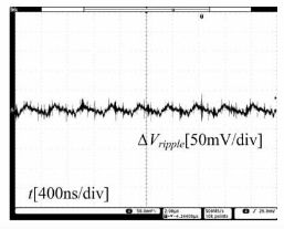 圖13給出了滿載情況下輸出紋波電壓的波形,顯然,輸出紋波電壓的波動(dòng)小,且無脈動(dòng),輸出紋波電壓得到了很有效的抑制。