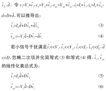 圖6給出圖5利用平均電路法建立的非隔離負(fù)電壓Buck開關(guān)電源CCM大信號(hào)模型。設(shè)Vi為輸入電壓的穩(wěn)態(tài)值,Vo為輸出電壓的穩(wěn)態(tài)值,Vpc為受控電壓源兩端電壓的穩(wěn)態(tài)值,Ii為輸入電流的穩(wěn)態(tài)值,IL為輸出電感電流的穩(wěn)態(tài)值,D為占空比的穩(wěn)態(tài)值。