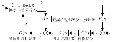 圖8為電流連續(xù)模式下峰值電流控制(CCMCPM)型非隔離負(fù)電壓Buck開關(guān)電源的系統(tǒng)框圖。控制環(huán)路包括了電流內(nèi)環(huán)和電壓外環(huán)兩個(gè)部分。補(bǔ)償網(wǎng)絡(luò)屬于電壓外環(huán),因此設(shè)計(jì)補(bǔ)償網(wǎng)絡(luò)需要先建立包含電流控制內(nèi)環(huán)的小信號(hào)模型。